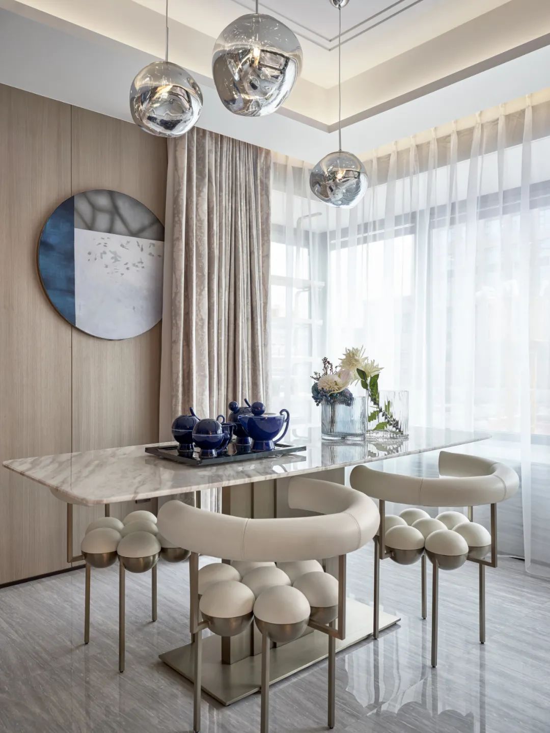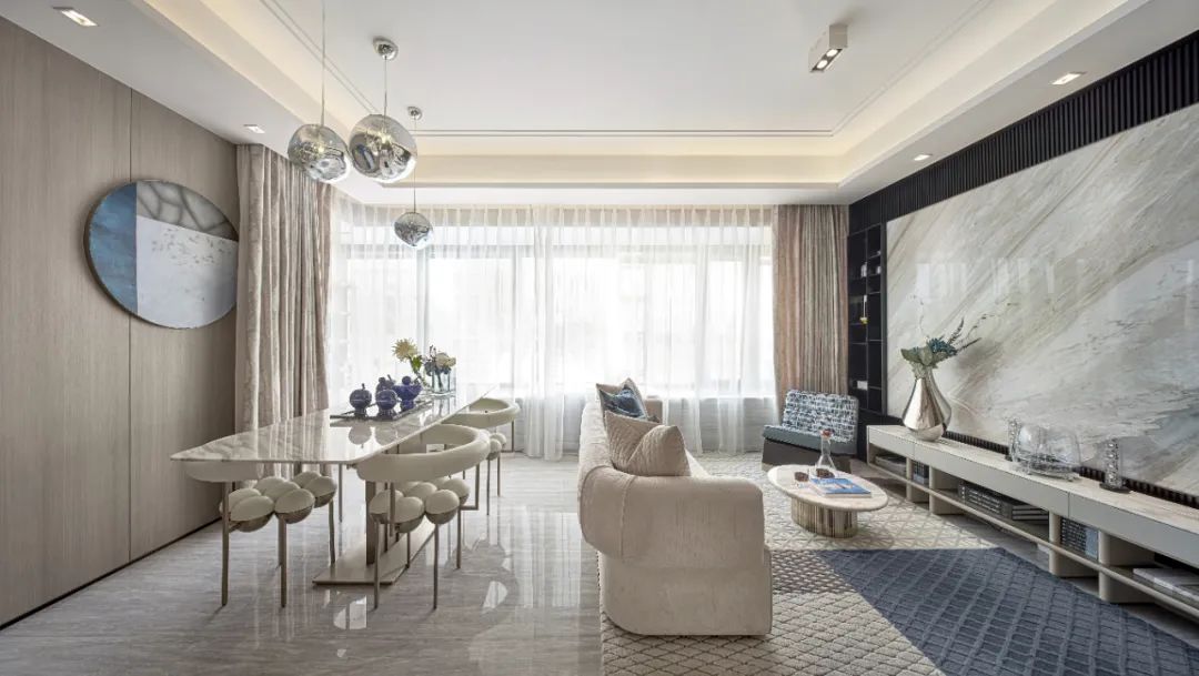 餐廳空間最大程度的地引用了客廳的自然光線,從早餐開(kāi)始便與陽(yáng)光相伴,使空間整體通透敞亮大氣嚴(yán)謹(jǐn)。