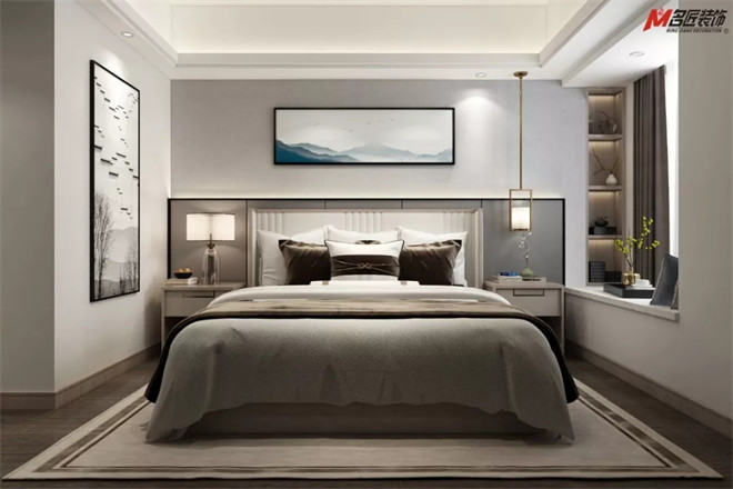 在公共空間的儒雅之外,設計師將濃重的筆墨留在了臥室。木飾紋面、精致的擺件,以和諧的比例出現(xiàn)在各處,淺灰雙人床、精美的邊柜、實用的衣櫥和床頭柜,無不展現(xiàn)出對細節(jié)的恰到好處。點睛之筆的壁畫和床頭燈飾呼應了江南風的小資情調,滿懷青春的浪漫溫馨。