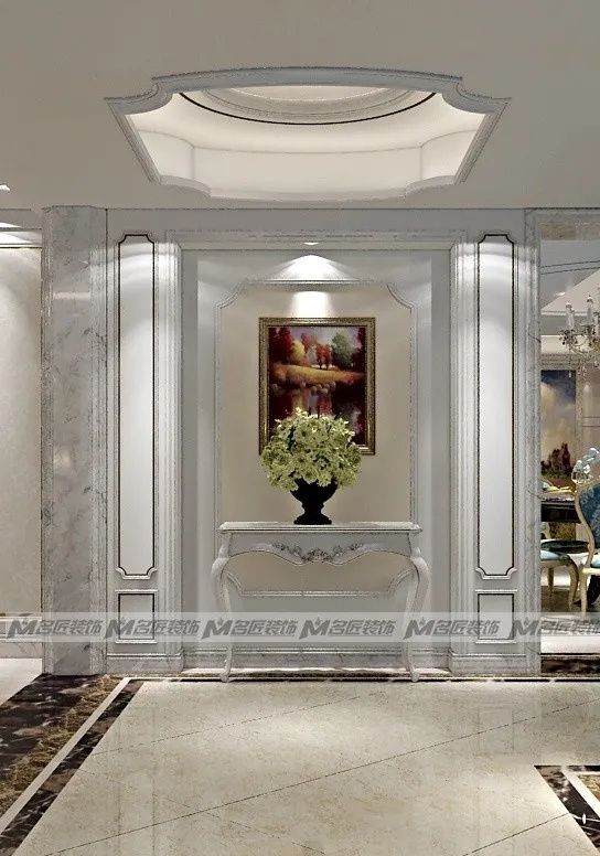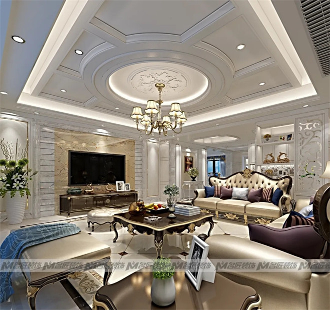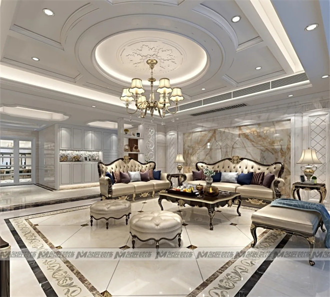 花紋對(duì)稱的金色大理石沙發(fā)墻面,線條對(duì)稱的白色窄框石膏線,以及復(fù)古的臺(tái)燈、擺飾,都展現(xiàn)出空間的規(guī)律美感,在視覺(jué)上達(dá)到平衡。造型古典的彎腿式沙發(fā),華麗的吊燈,精美的雕花鏤空隔斷,別致的拼花地磚,塑造出高貴典雅從容的居住空間。