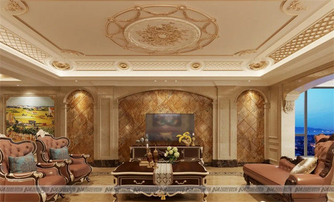 客廳的墻面大面積地使用米黃色系的石材來裝飾,與大理石拼花的地面相映成輝,石材天然的紋理使空間多了一份自然純粹。深色的皮質(zhì)沙發(fā)是客廳的主角,古樸典雅,藝術(shù)感濃厚。不僅帶來感官上的平衡舒適,更帶有莊重感。暖黃色的燈光在石材的反射下,整個(gè)空間流光溢彩,華貴絢麗。
