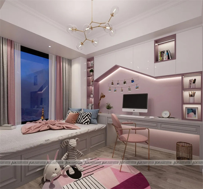 粉色大概是每個(gè)寶藏女孩都無法抗拒的顏色了,其自身夢(mèng)幻浪漫、甜蜜柔美的氣質(zhì)尤為吸引人。粉色的墻體與定制化的白色書柜相結(jié)合,滿足了收納與學(xué)習(xí)需求,照片墻滿載著小女孩美好的回憶。