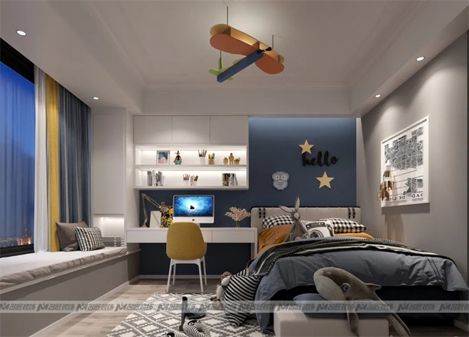 小男孩的房間營造出自由自在的趣味感,深藍(lán)色為主色調(diào),星星、鳥兒、卡通飛機(jī)吊燈、立體火箭裝飾畫作為點(diǎn)綴,好似進(jìn)入了一個(gè)擁有無限想象魔力的空間,承載著小男孩對(duì)宇宙滿滿的好奇心與探險(xiǎn)精神。