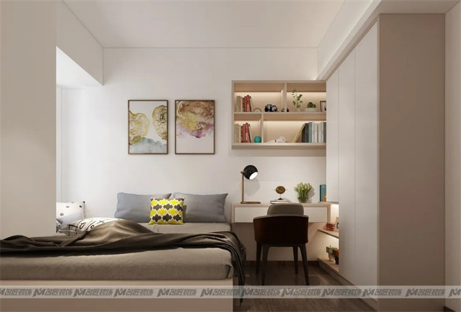 次臥的面積不大,設(shè)計師選用了衣柜書桌一體化功能設(shè)計,除了能夠節(jié)約空間,又滿足了工作、儲物等需求。