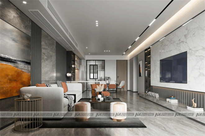 客廳的設(shè)計極具匠心,設(shè)計師通過不同材質(zhì)的替換拼接及色彩搭配,為整個空間定下了精致優(yōu)雅的基調(diào)賓利橙+高級灰的經(jīng)典搭配,將時髦感與奢雅感引爆,撩動心弦。