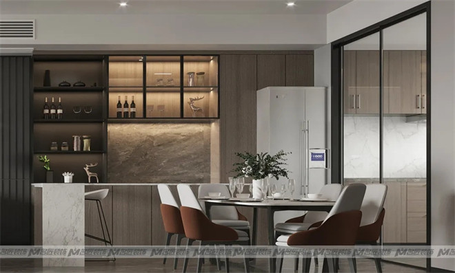 客餐廳一體化設(shè)計讓空間看起來簡約大氣,也增加了家人們的互動感,餐邊柜搭配小吧臺,形成一個功能緩沖區(qū),兼具實(shí)用及美觀