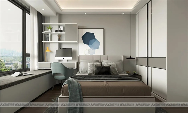 次臥的設(shè)計相比于主臥多了一分簡練,同樣低飽和的色彩搭配下增加了更多白色,讓人置身其中感受到輕松自然的氛圍