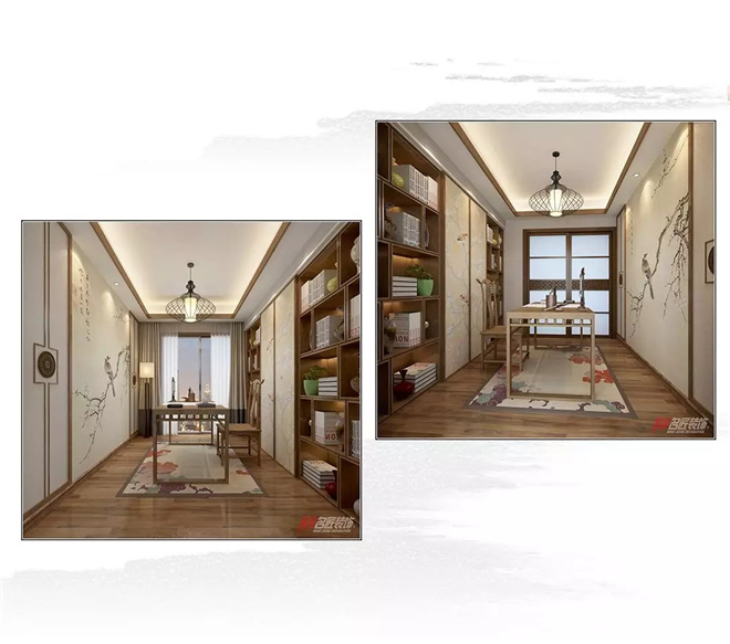 書房是除客廳以為最能體現(xiàn)主人氣質(zhì)的地方,空間的設(shè)計(jì)遵循中式的對(duì)稱美學(xué),中正的格局搭配貫穿本案的“鳥語花香”的壁畫紋樣,極力營(yíng)造人與自然和諧的畫面感