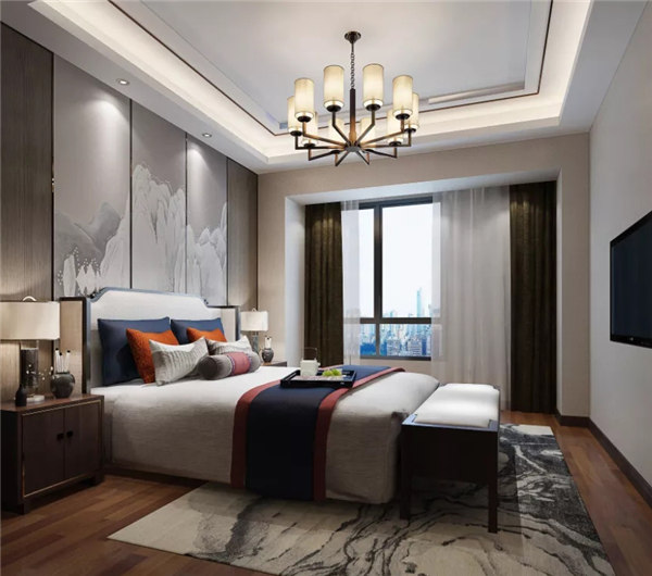 臥室色彩比較沉穩(wěn)低調,在用色上偏向舒緩、雅致,整體簡潔而不失優(yōu)雅。新中式燈具色彩鮮明,光線柔和,給人一種溫馨、寧靜的感覺。