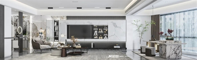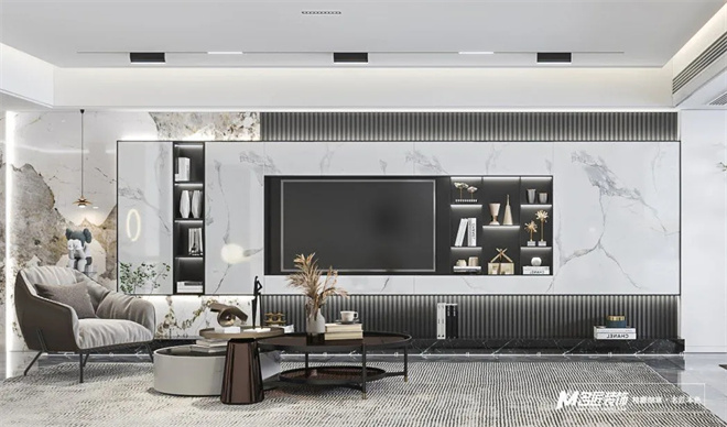 客廳黑白灰為主色調(diào),使得整體空間產(chǎn)生豐富的層次感,適當(dāng)?shù)牧舭?,在這種現(xiàn)代美學(xué)的基礎(chǔ)上進(jìn)行藝術(shù)化的改造。