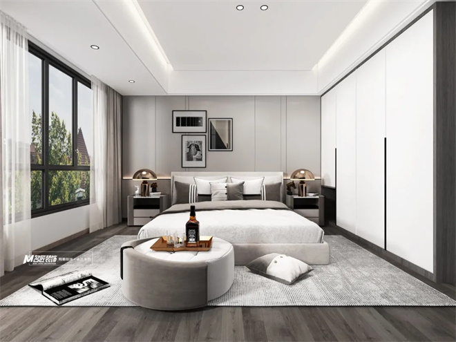 臥室中色彩靈活運用,形成自然靈動又不失沉靜的環(huán)境,大面落地窗保證了空氣,光影與人動線的流暢性