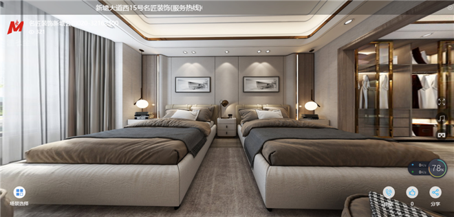 本案用材方面大量應(yīng)用了爵士白、銀白龍、古堡灰三色大理石,房門和地板的顏色采用了淺啡色飾面,窗簾和硬包的選擇也是以啡色和灰色來進(jìn)行和硬裝的融合,這樣的組合讓整個空間在視覺上不會顯得太過冰冷,讓人既可以欣賞到黑白色三冷色帶來的輕度奢華又可以感受到軟裝帶給我們的“暖”。