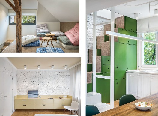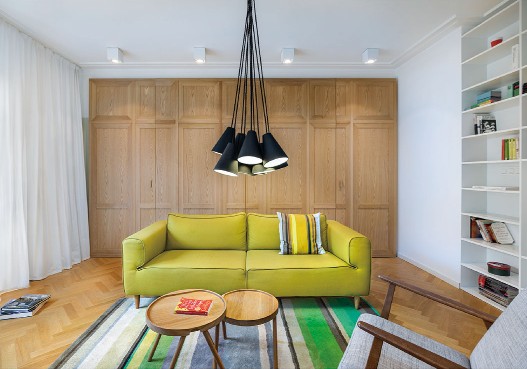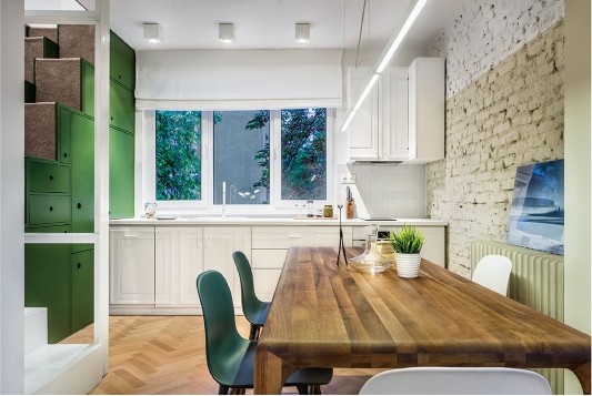 這是一間位于保加利亞的公寓,從結(jié)構(gòu)、模式甚至是顏色來看,這間公寓似乎比較單調(diào),很難找到出彩之處。客廳里,最搶眼的也只不過是一張青綠色的普通沙發(fā),還有一"盞"頗具創(chuàng)意的吊燈。整個空間色調(diào)都是綠自搭配,綠色給人清新舒暢的感覺,而白色則像純真潔凈的微笑那般干凈。其實,公寓是一個開放性的大房間,沒有門或者隔板,卻把每個空間都劃分完整;綠色的閣樓樓梯,看似是—個個收納柜,但設(shè)計師把廚房的電器都藏在樓梯柜里,省略了空間位置,又美觀實用;更隱秘的是,在卡其色書柜的后面是一個書房,而白色書柜后面則是一個單獨的臥室。空間簡而不單,打破常規(guī)設(shè)計,結(jié)合空間的地理特點,給平凡的生活制造點驚喜。
